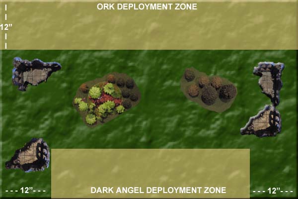 1. Each player rolls a D6 and the winner chooses a long table edge. 2. The ork player rolls a D6 for every troop choice in his army, and on a 4+ may deploy that unit on the board up to 12" from his board edge. 3. All other ork forces come in as reserves. 4. Dark Angel player deploys all his forces. 5. Dark Angels get first turn. |