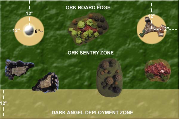 1. Each player rolls a D6 and the winner chooses a long table edge. 2. The ork player places the two objectives at least 12" away from any board edge and at least 24" away from each other. 3. The ork player deploys any of his Troop and HQ choices within 8" of the power plant of energy portal. 4. Any ork forces not deployed, enter the game as reserves. 5. The ork player then sets up his 12 gretchin sentries anywhere on the board that is not within 12" of the Dark Angel board edge , the Dark Angel deployment zone or the short board edges. 6. Dark Angel then sets up his infiltration force. The Deathwing force remains in reserve |