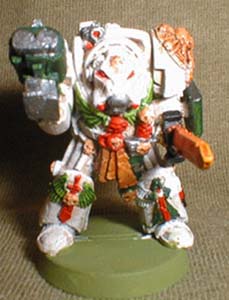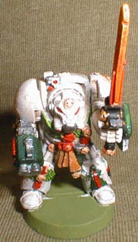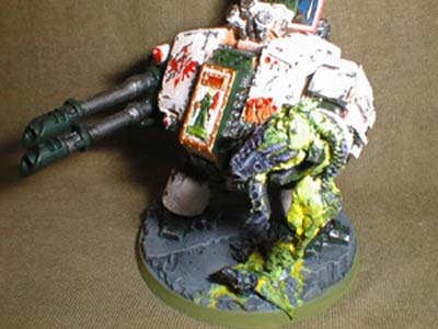 Tzadkiel is renowned within Chapter and througout the Imperium for his aggressive Lightning swift use of his Dreadnought close combat weapon. Because of this reputation and his desire to mangle every Hive Tyrant that he comes across when ever engaged in combat with a Tyranid Swarm that the Techmarines have fitted the Dreadnought, with the Twin Linked Auto cannon, along eith his close combat power fist. This enables Tzadkiel to take out the Tyrant Guards with ease from afar while he closes in for Close Combat with the Hive tyrant.