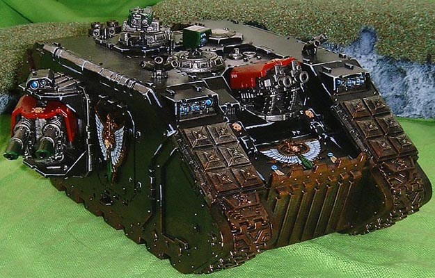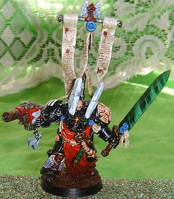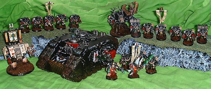 In Battle Donachiel is always accompanied by his command squad, their armament of lightning claws and heavy flamers is never changed. Their transport Land Raider allows them to always be where the fighting is the fiercest and most desperate.