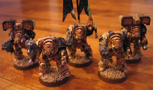 The 'Angel's Fury' Land Raider Crusader was borrowed from the 3rd Company upon Master Hadrian's request. Repainted to designate a Deathwing vehicle, the 'Angel's Fury' serves as an efficient transport for Master Hadrian and his ommand squad of and-picked assault terminators. In order to combat a multitude of various threats, there are 2 Lightning Claw Terminators, 2 Thunder Hammer Terminators, one Assault Cannon Terminator and one Heavy Flamer Terminator. |