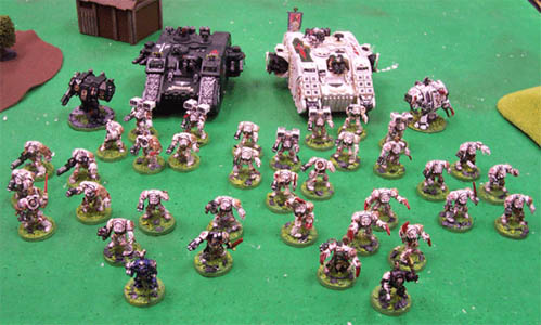 including six Tactical, two Assault, and one Devastator, as well as four Rhinos, one Razorback, and two Land Speeders.