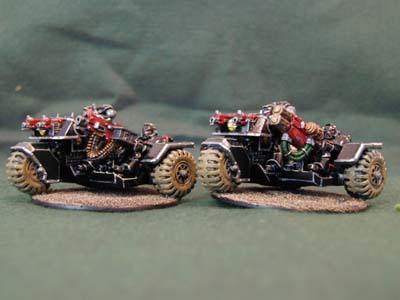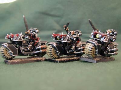 His command consists of three full strength bike squadrons, two smaller squadrons and five attack bikes which are deployed according to the tactical situation. Three landspeeders lend speed and flexibility to command. |