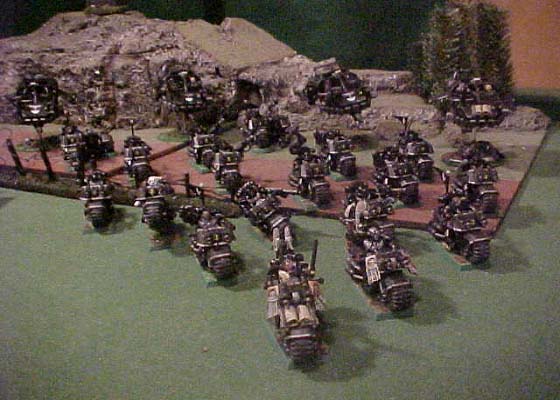 The force is lead by the newly appointed Grand Master of the Ravenwing Ward, and comprises of the remnants of the company after Delios IV. Ward's battlefield promotion to Grand master of the company was Supreme Grand Master W's first act after assuming command of the Dark Angels, and Ward was sent to track the Thousand Sons so they would not escape. Ward has tracked the Thousand Sons to the sparse Thromos system and has led his force on several of the system's planets in an attempt to find the warband's base. Ward has encountered several groups of Thousand Sons so far but also forces of the Death Guard Legion. It is unsure whether the two traitor forces are working together for they have never appeared side by side in battle but the Death Guard have taken advantage of Thousand Sons raidings and some level of co-operation seems likely. |