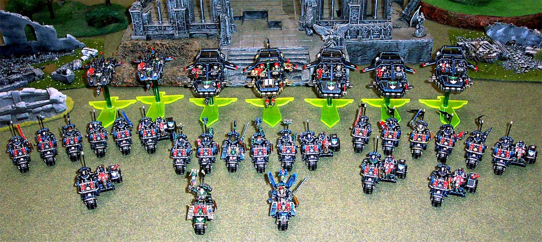 A secret battle force crusade named Angelus Mortiferus Pinnatus has been dispatched to seek and hunt down the fallen. The 4 Main Houses of the Dark Angels have come together by the sacred will of the Emperor commanded by a section of the Angels of Absolution. They were chosen to lead this Holy Crusade to purge the Imperium of Chaos and all heritical activity. Along with the special strike force command group of Absolution there arose a section from the Angels of Redemption, Angels of Vengeance and a large contingent of the mighty founders The Dark Angel's. The endeavor of hunting down the fallen necessitates a good scouting group that can operate will beyond the main force at various times. Three top sections of the RavenWing, along with its multi-potent leader Grand Master Corvus and Interragator Chaplain Leviticus, were forged to accomplish this task. Only the best and stout hearted were chosen to act as trailblazers for the main battle force. Time is short and the day of chaos is at hand. These few men are the best at scouting and guerilla tactics; recruited from the appropriate worlds that produced and molded these fine warriors so long ago. |