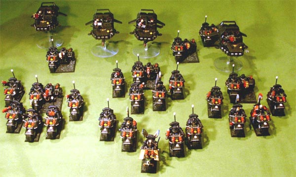 A strike force detachment from the second company of the Dark Angels chapter. Led by the commander, Grandmaster Dharkon, this strike force played a vital roll in leading the company sized assault of the ravenwing on Kasr Sonnen during the campaign against Abaddon's blasphemous hoards.
