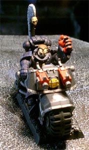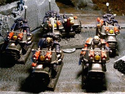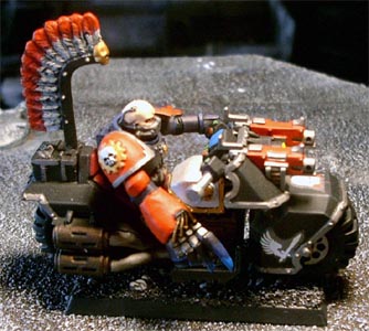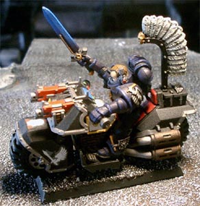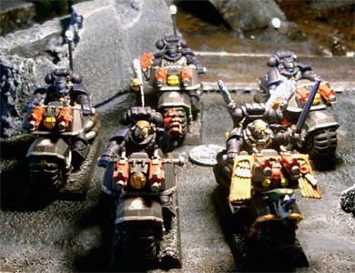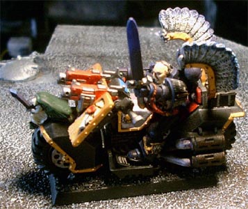 Relatively new to the Ravenwing, Dharkon rapidly showed his mettle in battle. He is usually accompanied by his command squad which is always armed with two meltaguns. His aide, veteran sergeant Korbus has a predilection for the powerfist. The combination of the mgrandmasters power weapon, Gorbus' pwerfist and the two meltaguns usually make short work of any significant opposition they come across. |