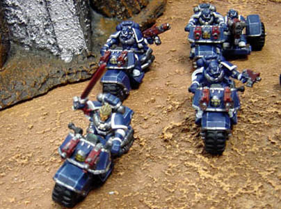 This fast attack squad is lead by brother Almadiel from the Virtus circle. He's an expert on lighting actions with his bike but for Ignis crusade he had to bring on battle even the cumbersome Attack bike to give the chaos scum some melta heat taste where his beloved power sword could achieve nothing. The bike squad is accompanied by Venator, the landspeeder also armed with a multimelta.
