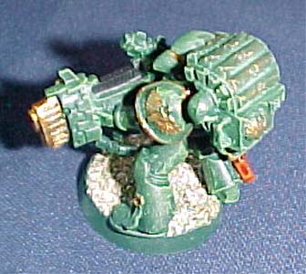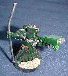 Wargear: Plasma Cannon. Notes: Corporal Devous is a time bomb. He fires fast and generally without discretion. Though inherently dangerous, he is also fearless, often standing in plain view and in an elevated position. Devous' foolhardy tactics may be a death wish or an un-relentless search for glory. Only Devous knows the fate he seeks. Taechalius views him as a heart-strong fighter, worth every risk he poses. Once, after the squad had ducked down to avoid in-coming artillery barrages, Devous jumped up, hitting the enemy while they expose themselves to take advantage of their fire support. For this he was honored with a purity seal, which he proudly displays on his plasma cannon. |