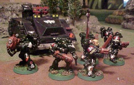 Tactical squad 5 was another squad that had to be reorganized due to casualties suffered on Delios. The squad held off the orks while the others boarded the thunderhawks and lost several members doing so. Since then Hart has lead the squad on infiltration raids, as Battle Force Fury has no scouts at present. Hart and his men have used the skills they learnt while serving as scouts to good use even in their cumbersome power armour they can still sneak past enemy pickets and patrols to perform guerilla raids against supply lines and bases. In one infiltration raid they tracked a squad of Death Guard marines through the jungles of Kiln, hunting them down and picking them off one by one until only three chaos marines remained. The Death Guard formed a defensive ring in a clearing to make their last stand, so Hart attacked in the dead of night and all three were killed. |