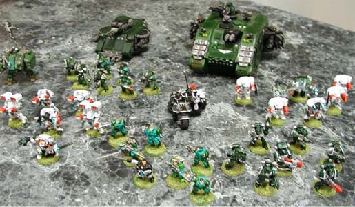 There are also many things that were dissimilar, most noticeably the absence of a true Deathwing. Although they call their first company the Deathwing they do not all wear Tactical Dreadnought Armour, still however considerably more than most other chapters. Also all brothers are encouraged to keep there original names and because many take up this offer the names appear to be as varied as their recruits are. All this changed by several key instances, starting with a battle on an insignificant 'backwater' world. This battle involved a dug in and outnumbered small force of Dark Angel's lead by the Ezekiel himself. The Angels of Deliverance came in force and helped dig the Dark Angels out of trouble, with Alsektar (the chapters Supreme Grand Master) fighting side by side with the most revered Ezekiel. After the battle the Dark Angels left with little more than a short and formal embrace between Ezekiel and Alsektar. The chapter for a while afterwards seemed to find themselves by no known design fighting along side their parent chapter in skirmish after skirmish. Every time the Angels of Deliverance would start a campaign to find the Dark Angels helping out before its end. After not seeing the Dark Angels while fighting in the second war of Armageddon they began a campaign to destroy a force of chaos on a world known as Kassandar. This battle lead to them becoming entrenched on a plateau atop Mount Cimmerian, the highest point in Kassandar. When all looked lost with an overwhelming force of Khorne baring down upon them the Dark Angels once again intervened. After helping to drive off the horde a meeting was called between Alsektar and the Dark Angels Inner Circle. Alsektar and his chapter it seems had come to the attention of the Dark Angels and with Ezekiel's blessing was to be inducted into the chapters of the Unforgiven.