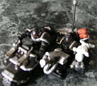 Ravenwing Attack Bike Squadron 'Ziquiel' Minor Veteran Sergeant Atreus usually leads squad Ziquiel into battle however he has taken the rest of Squad Eziquiel on recon duties leaving there attack bike to assist in the upcoming battle. Veteran Sergeant Atreus and his squad Ziquiel are one of the limited numbers of Ravenwing squads on the planet of Argus. Most of the Ravenwing brothers of the circle are assisting Alsektar or performing recon on a number of other worlds. Atreus beginnings, like many others, dates back to the battle of Armageddon where he had his commander, his squad leader and several of his brothers die under a massive ordnance barrage. As one of the few survivors he was promoted and has quickly become one of the best squad leaders in the Ravenwing. Due to this and his utter dedication he is been considered for further induction into the halls of the circle and promotion beyond his current rank. |