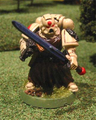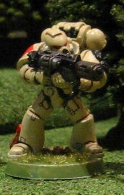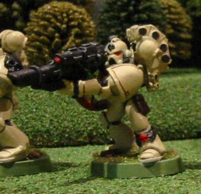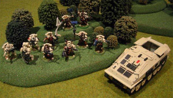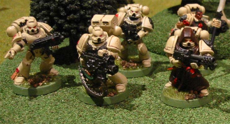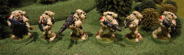 This five man squad is lead by Veteran Sergeant Araziel, who was inducted in to the sixth level of the Inner Circle of the Shadow Knights after his exemplary conduct in the Kraxus Prime Assault landings. He is armed with a power sword and bolt pistol. The squad consists of five Shadow Guards, three armed with their customary bolters while the fouth wields a powerful meltagun and the fifth carries an ancient lascannon. They are mounted on a Razorback Mk IV (Thragos pattern) armed with twin-linked Lascannons and protected by extra armour plating and smoke launchers. This allows rapid battlefield maneuverability and mobile heavy fire power.