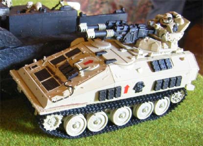 The holo-vids below show the squad deploying for action along with more details of the unique changes imparted by the Thragos Pattern on thier Razorbacks. Tactical Squad Araziel is mounted on a Razorback Mk III "Thragos Pattern". Armed with the heavy anti-tank armament of twin linked lascannon it is the premier antitank platform in the force. Smoke dischargers and extra armour protection are standard fit on all razorbacks. |