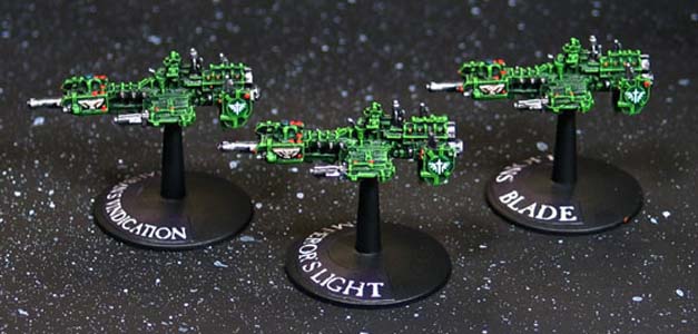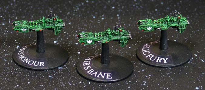 The Hunter Class Starships are often used by the higher ranking officers of the Dark Angels for missions that might require a smaller task force. Interrogator Chaplain's will use them for their secret missions, as will the Librarians of the chapter. They are armed with torpedoes and are very fast, making them well suited for Fleet protection as well as for rapid planetary assaults. |