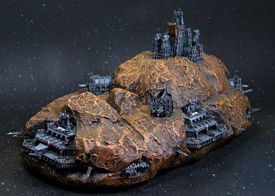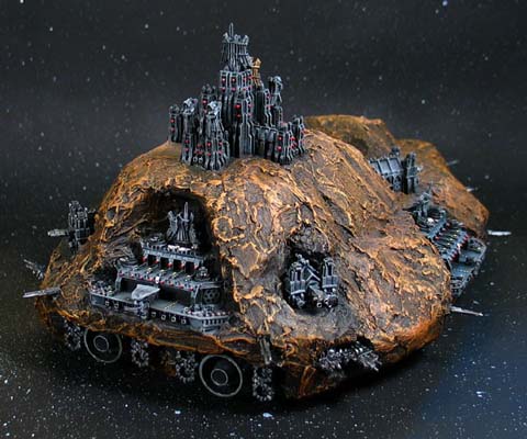 This vast continent sized asteroid, which is the sole surviving part of the Dark Angels home planet now capable of sustaining life is also affectionately known as the "Rock". This segment of Caliban had contained the largest of the fortress monastaries in which the Dark Angel legion was based. Following the destruction of their planet, the asteroid has been made the home of the Dark Angels chapter. Massive warp and real space engines powered by gigantic plasma and warp cores propel the whole planetoid to wherever the Dark Angel wish to go. During the closing stages of the thirteenth black crusade,the Tower of Angels was seen in cadian space heading for confrontation with Abaddon's planet killer. |