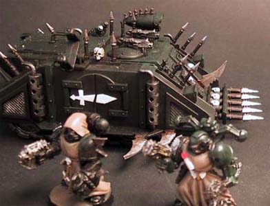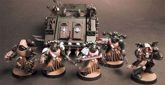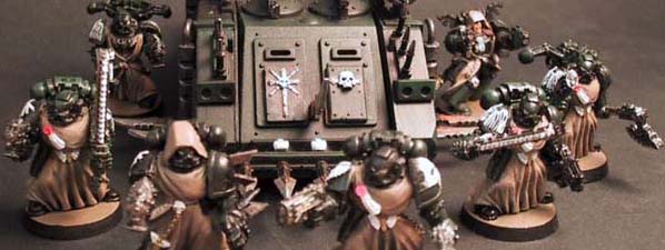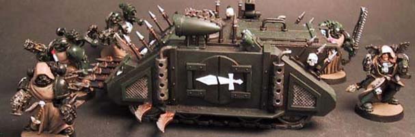 A squad of fallen angels sighted at an unknown location. Travelling in their warped rhino transport, they were seen accompanying the arch-heretic Cypher. Sadly, no trace of the Imperial guardsmen who obtained this holo-vid or who accompanied this squad were ever found again.