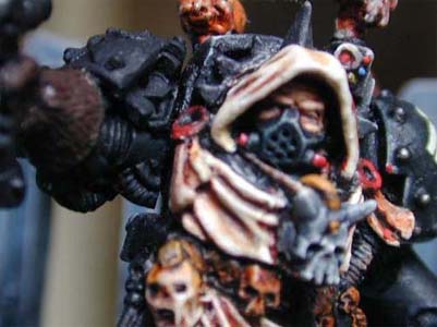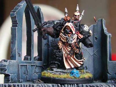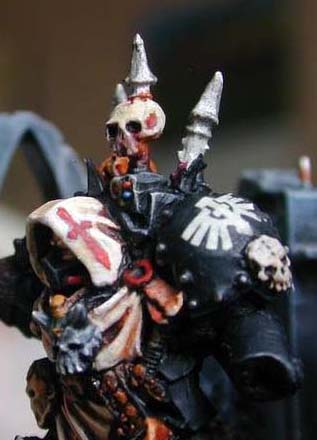 No one knows his name nor what his purpose is, but we do know that this Fallen Angel has killed in the name of the False gods. . The abomination that was once a champion of the emperor is seen to be missing it's left hand. Very likely it is in the process of some cvile chaotic mutation.