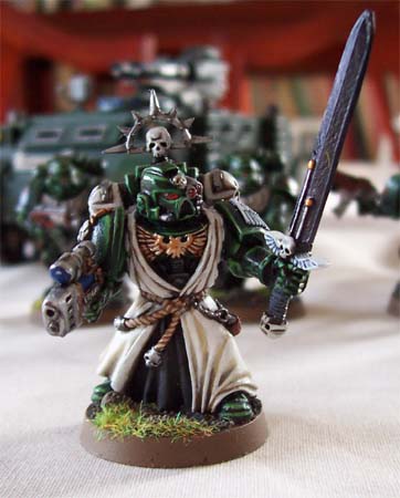 Famous achievements: Master Pellinor has only recently attained his rank. He is unusual in that, although he is currently attached to the fourth company, he is not a Company Master. He owes his elevation to the rank of Master due to his involvement as a member of the Deathwing in the Rhessus-world incident. The Dark Angels assaulted a hive city that was in the upheaval of rebellion. Under the cover of the assault, two Deathwing squads led by Interrogator-Chaplain Aradiez teleported into the traitor headquarters in an attempt to behead the rebellion. It turned out to be a costly mistake; traitor marines of the Alpha Legion turned out to be waiting for the Dark Angels and a heavy toll was exacted on the teleporting squads as they appeared in the open, including Aradiez. However, Pellinor was able to gain control of the situation and regroup his men before launching a counter-assault that cleared the enemy firebase. Seeing the terminators gaining the upper hand, the Alpha Legion attempted a counter-attack of their own. But now that the Deathwing were in cover they were able to bring their true potency to bear and the counter-attack was repulsed with heavy casualties. Without hesitation, Pellinor pressed his advantage and was able to engage the traitor commander in close combat and kill him. But it was not without cost; not a terminator escaped without an injury and Pellinor himself lost an eye. Without their previous co-ordination, the rebels on Rhessus were quickly exterminated.