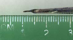 To begin, you have to have a rather small paint brush. The one to the right i think used to be a 10/0, but now after much use and scraping off paint, has become smaller. This is what i use for small detail work. **BE WARNED** If you look closely at the base of the bristles, you can see a large pile of paint. NEVER let this happen tou your brushes. I'd remove it, but I fear that it will take all the bristles with it. Always clean your brushes out thoroughly, else this happen to yours. Another side note, almost all painting was done with the paint watered down. This makes it easier to work with, and blends better. Water it down to milk consistency, or even more. It never hurts to put more layers on because one doesn't show up then scrap the whole thing because one shade is too bright. |