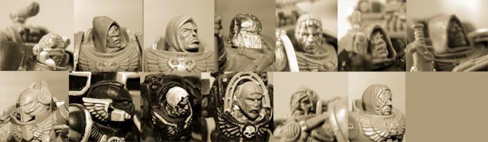 Best heads out there for Dark Angels are in the Brettonian Archer box. They have hoods and enough medieval feel to them. You can futurize them by chopping of parts from the helmets and glue them on, even the blindfolded one can be used. Use them on your Marines and Termies. Some other archaic helmets can be found in the Iron Warriors box which gives you some bionics as well. You can also add the wings from leftover banner poles. |