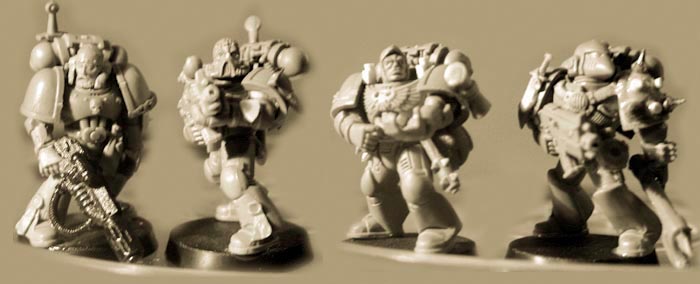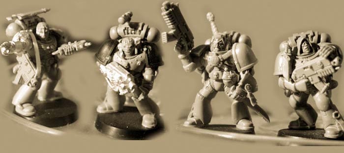 So just a few pics to show some of my assembled examples (of which you have seen some detail shots already). Greenstuff is still required to smooth out some connections and maybe to add tabbards. This is the new Tac Squad, Sergeant will be the metal miniature from the Dark Angels box without any major conversions. |