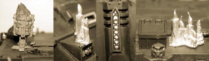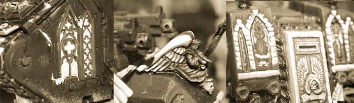 The braziers are from the archer box as well (THE bitz box for DA!). Candles add a sanctuary feel and are from the Darkelf's Cauldron of Blood. I also use the gothic chest and trunkets instead of Imperial styled ones. Gothic windows are from a fountain model of a train model range, go check it out, if you find that box (VOLLMER, HO 3758, Historical Landmark), you'll have enough windows for a whole vehicule park! The easier way for gothic windows is to cut them out of plasticcard (Drreadnought) and paint stained glass patterns into it. And not to forget that Ravenwing Angel from the GMotRW. Add them everywhere. |