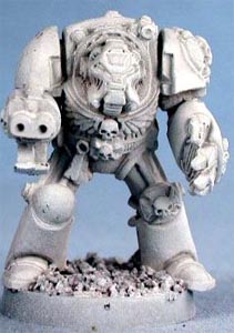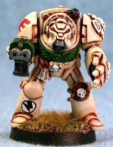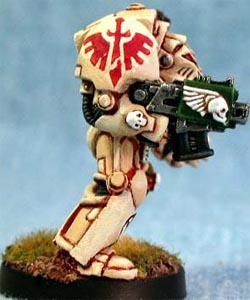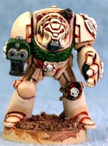 Step 9 - The proper army badge and the Deathwing emblem are placed. Decals were then painted over after being set properly. Other finishing touches such as the writing on the Purity Seal were done with a 005 Pigma Micron pen. |