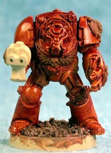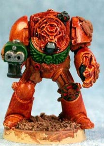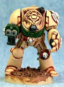 Step 4 Continued: The gun casing is done just like a standard DA trooper. The reds and black are done similar to ways that have already been discussed in the tutorial. The green chest eagle has a slight deviation from normal. It starts with a DA Green base. It then gets a 50/50 DA/Snot for the first highlight. Pure Snot Green is the 2nd highlight and this is finished off with a 50/50 Snot/Goblin highlight. |