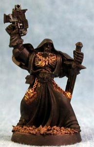Step 1 - This is the preparation step. The mini has been cleaned, filed, prime coated (black) and in this case had all the dry brush steps for a base done to the gravel. Part of the clean up also included taking off the Dark Angels shoulder emblem and filing it down. |