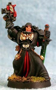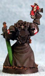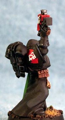 Step 32 - The mini gets finishing touches here. First touch up an areas where the paint may have gone haywire on you. Metal studs on the armor were picked out in GW Boltgun Metal. Chapter and Squad markings were then added to the shoulder pads. The backpack was attached and the mini was given two coats of GW Purity Seal. |