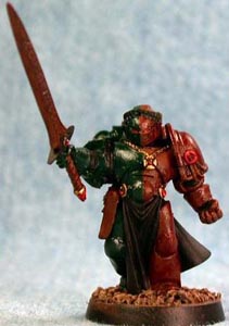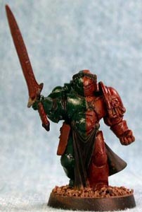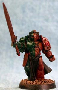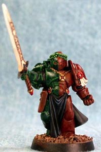 Step 1 - The mini has been primed black and then had its base coat (half-n-half) of Dark Angels Green on the right and Cleric Brown on the left. Cleric Brown was also place anywhere that leather or lighter bone work would be done later on. |