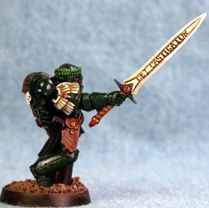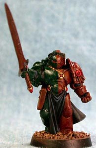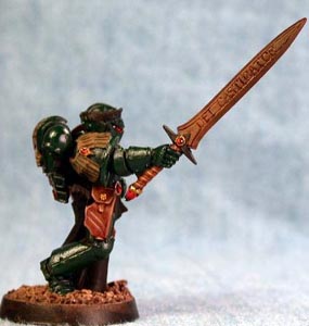 Step 6 - Black areas (ribbing, tabard and sword hilt) were first highlight with a two parts Shadow Grey to one part Chaos Black mix. This was followed up with a second highlight of Nightfall Blue. |