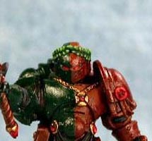 Step 9 - The Dark Angel green side of the mini was highlighted next. First with a 50/50 DA/Snot Green mix. This was then followed by a final highlight of pure Snot Green. |