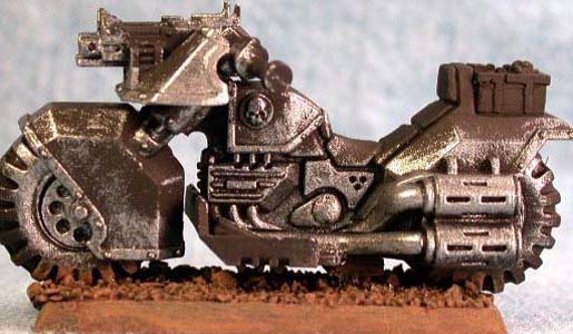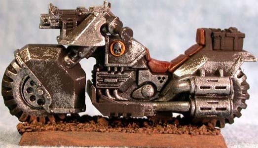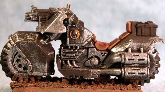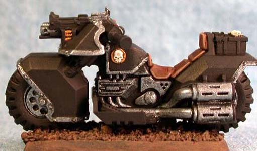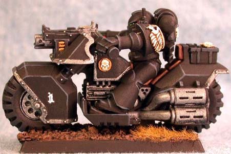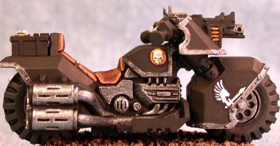 Step 7 - Final Touches!: The bike is ready to be finished at this point. Start with a highlight of one part Chaos Black / two parts Shadow Grey. This was then given a second highlight of NightFall Blue. Rivets were picked out in Mithril Silver and touch ups were done with Chaos Black. The rider is effectively done in the same way or you can check out the Angel of Vengeance Tutorial for a more detailed black armor how to. |