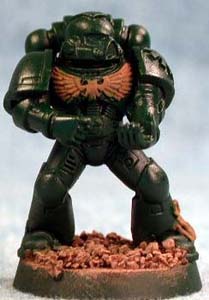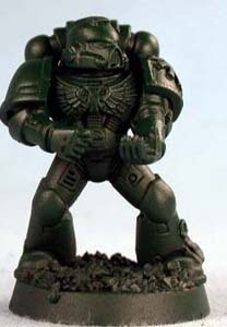 Step 3 - For step 3 the entire mini gets a dark green ink wash. This helps to deepen the green and give it a bit of shine that I've always felt fits with the Dark Angel color scheme. |
