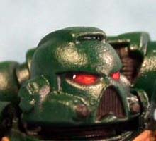 of the eye Chaos Black, the eye visors get a coat of Ral Partha Blood Red (GW Scab Red). Starting at the front of the eye and coming back about half way over the RP |