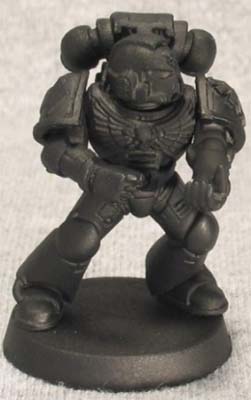 Put your Marine together. Notice that I have not glued the bolter onto my Marine, because when that thing is on, it makes priming and painting underneath that bolter a royal pain in the keister. I don't like taking the extra time to cover the area behind the bolter with a brush or do the contortions necessary to paint the chest eagle nicely with the bolter in place. It's really easy to glue it on when you're done, so just leave it off and prime it separately. A suggestion: use your chest eagle Marines for tactical Marines (those with bolters) and use the others (like the single skull or the power cables) for heavy weapons. You pretty much have to put these together before priming, and you can hardly see the eagles anyway, so why put all that work into something no one can see? I use black spray primer for all my minis. Why?