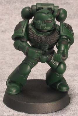 OK, here is Lazy Painter's Rule #1: LPR #1: Water down your paints, but not too much: Why would you do this? Isn't it easier to just take it straight out of the pot? Well, yes, it is. But if you do, the paint will be gloppy and leave brush marks on the model. That means you have to go back later and paint over it. I hate painting over an area I've already painted, so I water my paints down instead. It also just looks better and doesn't obscure detail. However, you don't want to go and water down your paints to the point you've got slightly green water. I've heard of painters using 4 parts water to 1 part paint. In my mind, they are insane. Of course, many of them have Golden Daemons, and there's no way on Earth that I ever will. The problem is this: with a 4:1 or similar ratio, you have to paint an area multiple times in order to get decent coverage. Like I said, I hate painting over an area I've already painted. I use a ratio of about 3 parts paint to 1 part water. I'll just stick my finger into my clean water, shake it off into the paint on my palette, and stir it around with a toothpick. That's about enough to allow you to paint an area once and get a nice coverage without being gloppy. My example model was painted with only one layer of Dark Angels Green watered down as stated above. Notice that I didn't paint what will not be green, like the chest eagle and the eyes. Heck, I've said it enough that it should be Lazy Painter's Rule #2: