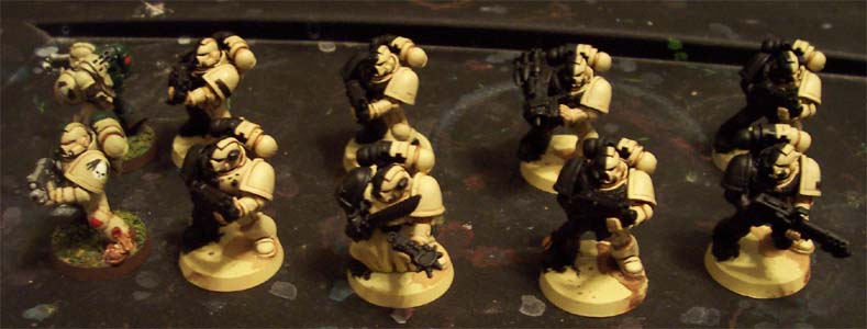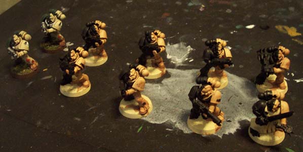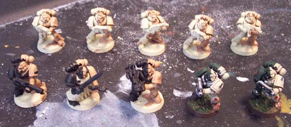 This is the starting point for my entry into "The Great Race" group painting challenge. Three stages of painting are pictured here. Two completed marines can be seen in the front row to the right. Three are in the Black Undercoat stage, also in the front row, and five are in the Primer and Wash stage in the back row. I will bring the five in the Primer and Wash stage up to the Black Undercost stage, then move all seven forward together in steps towards completion. |