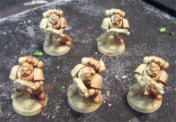 I commit heresy by priming any Bone/White armored minaitures with Bleached Bone. I use the GW spray, then touch up any areas with incomplete coverage out of the paint pot. Then I do a medum wash of brown paint on all the areas that will end up with bone or white colored armor. In the case of the Angels of Repentance, that means only the right half (from my perspective) get the wash. |
