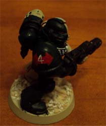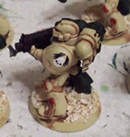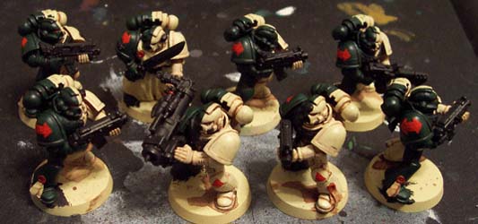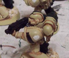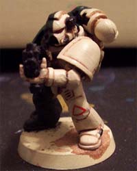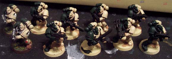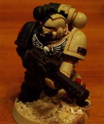 I use Skull white to paint in the Squad number. A nice thin brush and even paint are the keys. Don't blob it. The same theory on the chest eagle and a dot in the back corner of the eyes for lens reflection. In each case, I use the under colr to clear up any mistakes. I find patience is the key here. Taking the time to clean of the brush and shake the paint between each mini. |