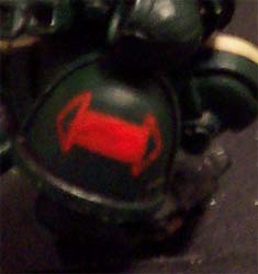 I added all the red bitz next. All painted using blood red. Eyes and lenses are painted red over the Chaos black, then cleaned up with a black outline as needed. Purity seals are red also, but in the center, the black is allowed to show through to give the wax stamp some character. The Army Badge I use is a simple one, a red triangle on the left knne or grieve. I paint the outline first, then fill it in. Same process on the tactical squad markings. Two parallel bars first. These are important to get parallel to the bottom of the shoulder piece. Then I fill them in and outline the arrows, which are filled in finally. The tactical arrows always take a second coat as the green shows through, but I am not looking for super bright arrows, so only one additional coat. |