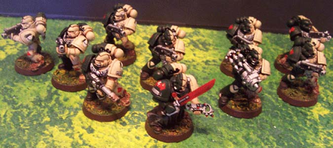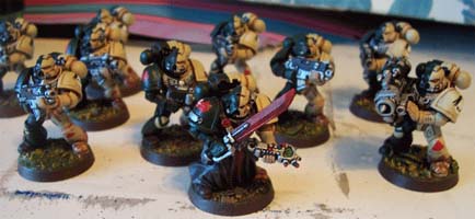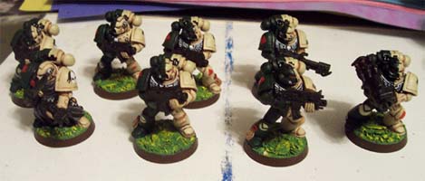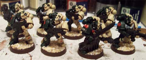 I used Mythril Silver to pick out all the bolts, ventilator hoses, fins on the backpacks, helmet targeters, misc. skulls, boot hoses, etc. This is another case where keeping the paint from glooping is important, as the metallics really want to do it. Most touch ups were accomplished with Black, as they help outline the silver anyway, making it pop. My Sgts. robes got the Chaos black treatment. Then I used a controlled dry brush line and Codex Grey to paint all the folds and ridges in the material. This is pretty stark contrast, but I don't mind it in this case, as it will help him stand out on te tabletop, where these guys are destined. |