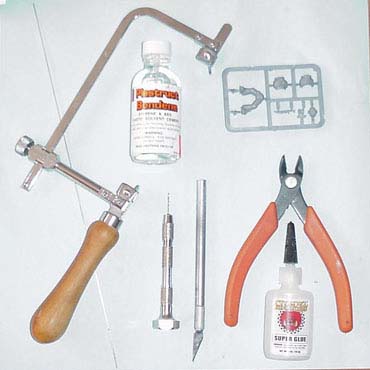 Step 1 - Initial preparations: Firstly, the basic tools that will be required are pictured here: 1. A jewelers saw 2. Hobby knife 3. Pin Vice Drill 4. Brass Rod 5. Liquid Plastic cement 6. Super Glue 7. Marine model 8. Green Stuff (Not pictured) |