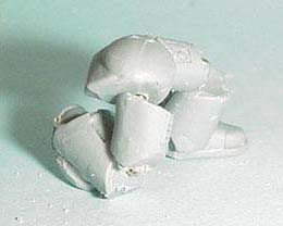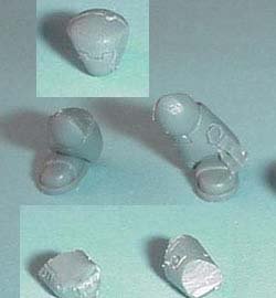 Step 3 - Using the jewelers saw, carefully separate the legs into 5 pieces. Cut it at the knee joints (preserving the kneepads), and the hip joints. Remove all of the corrugated areas that survive the cutting process. (These will be replaced later with greenstuff) This is what you should be left with...... |