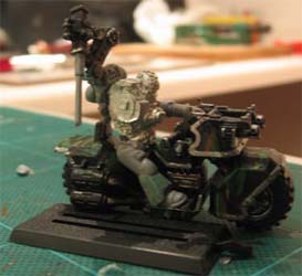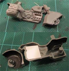 I've built up layered armour on the front and rear wheel arches of the bike like the new techmarines as well as cutting away both of the top exhausts, if the engine is plasma driven less exhaust would |