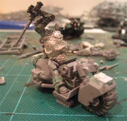 How to model a Techmarine riding a bike: When the new SM codex was released there was a lot talk of how powerful a Techmarine on a bike would be. I don't play the game but thought it would look cool. So I've started one and will keep updating this thread with my progress and pictures. What I want to do is to model a Techmarine who fits the look of the current crop of techpreists, using the torso of one of the metal ones and falling back on converting the rest. I used the boxed set Techmarine because wearing a helmet on a bike in a war zone just makes so much good sense.