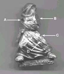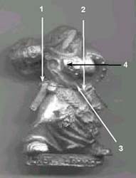 Step 2 - Preparing the body: I first had to carefully remove both Ezekiels arms. As you can see in figure one, this is no easy task as both arms are folded closely on to his body. First to go was the right arm, which I took great care not to damage as I intended to use it after repositioning it. I cut along line 1 as indicated using a jeweller's saw. (figure 2) There was no way I could remove his left arm in one piece so had to saw through it as shown along lines 2 and 4 in sequence. Finally I sawed out his large book of secrets along line 3. (figure 2) What I ended up with is seen in figure 3. A points to where the right arm was, and B where the left was. C is where I remove book of salvation, D another book and E his keys. A little bit of filing to smooth out the cut surfaces, and I was ready to select the arms. |