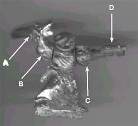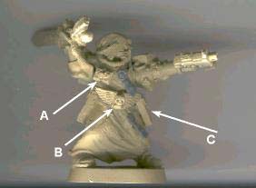 I had the right arm positioned behind his had as if he was about to swing a mighty blow. nitially I had the sword positioned so that it would be behind his head, but as the hood interfered a lot, I ended up with the current pose. (A & B) I also positioned the boltpistol sideways (D), just to be different, little realising the implications of being tainted with a "John Wu like Gangster Pose" which resulted in many an interesting discussion on the net! |